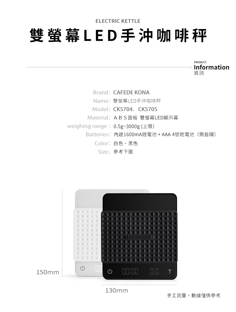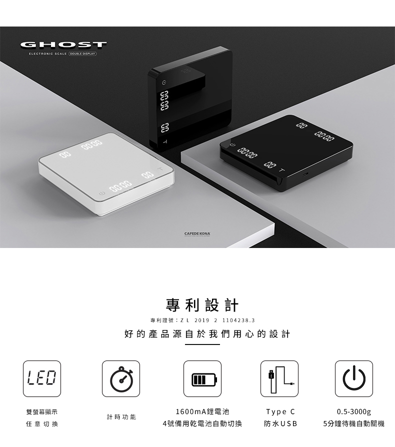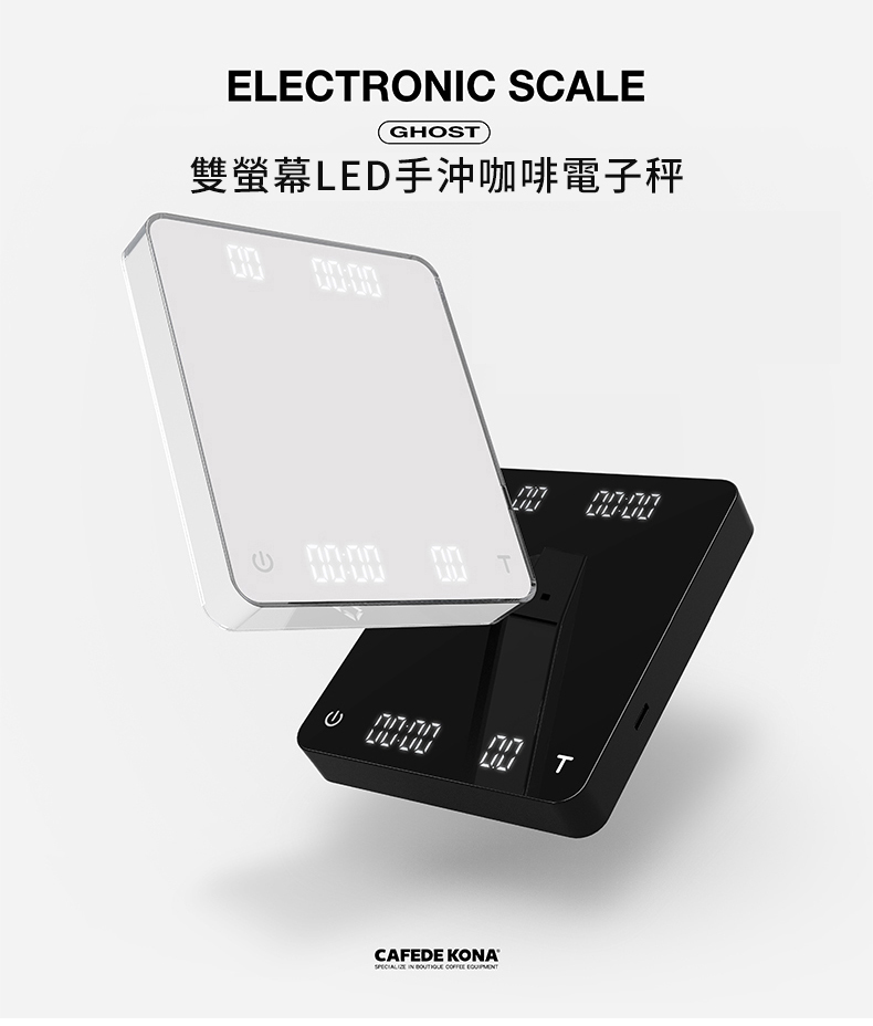 CAFEDE KONA GHOST 雙螢幕LED電子秤 黑色 手沖咖啡電子秤 計時 USB充電